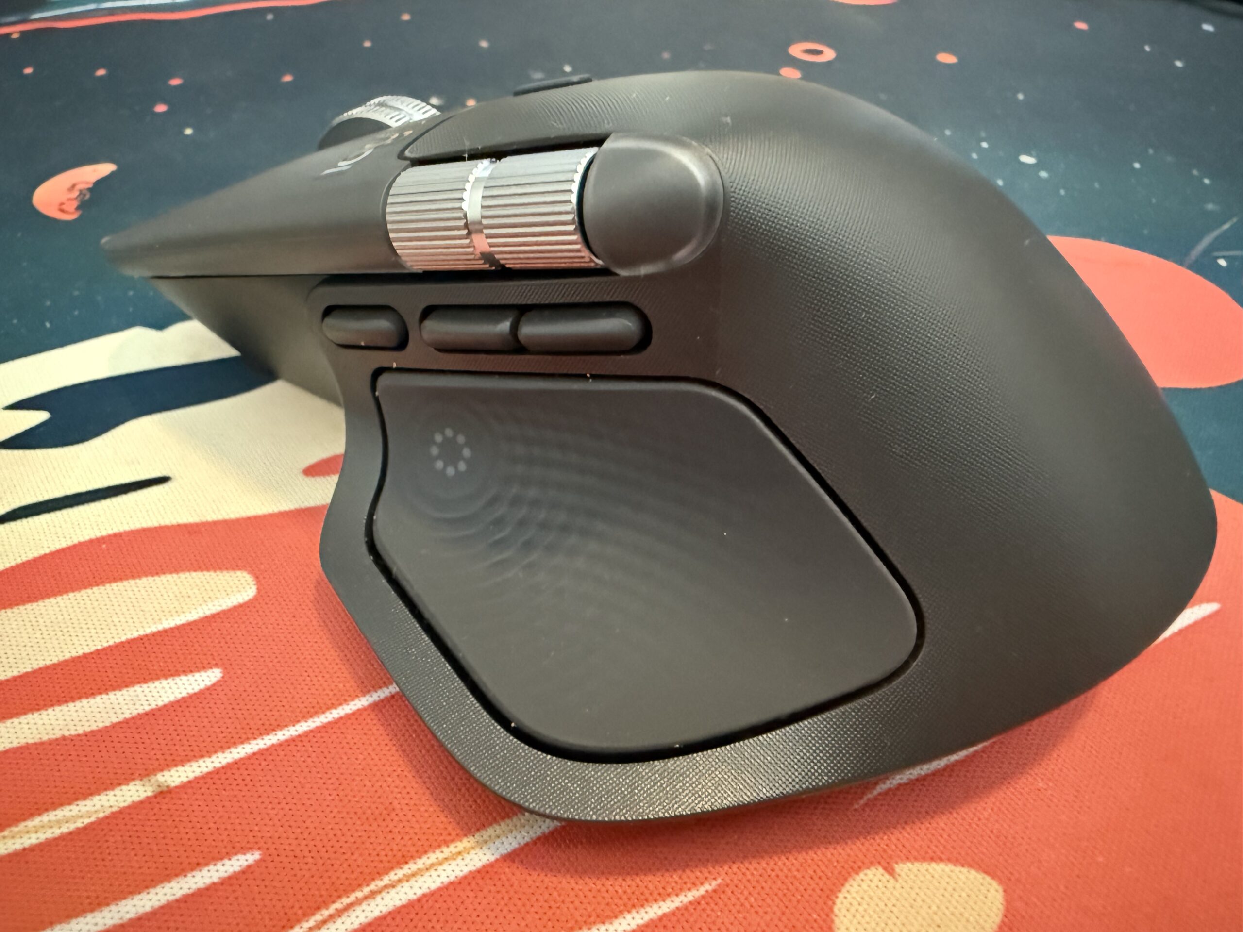 The buttons are quiet with a firm, tactile bump. You can feel each click but you can’t really hear it — and over a long day, that quietness matters. The scroll wheel deserves special mention: it switches automatically between precise detents and a free-spin mode that glides through long documents or log files. Once you get used to that, every other mouse feels crude. The side scroll wheel by the thumb is another subtle luxury. I have mine mapped to system volume, but it can also scroll horizontally, zoom, or handle app-specific functions.